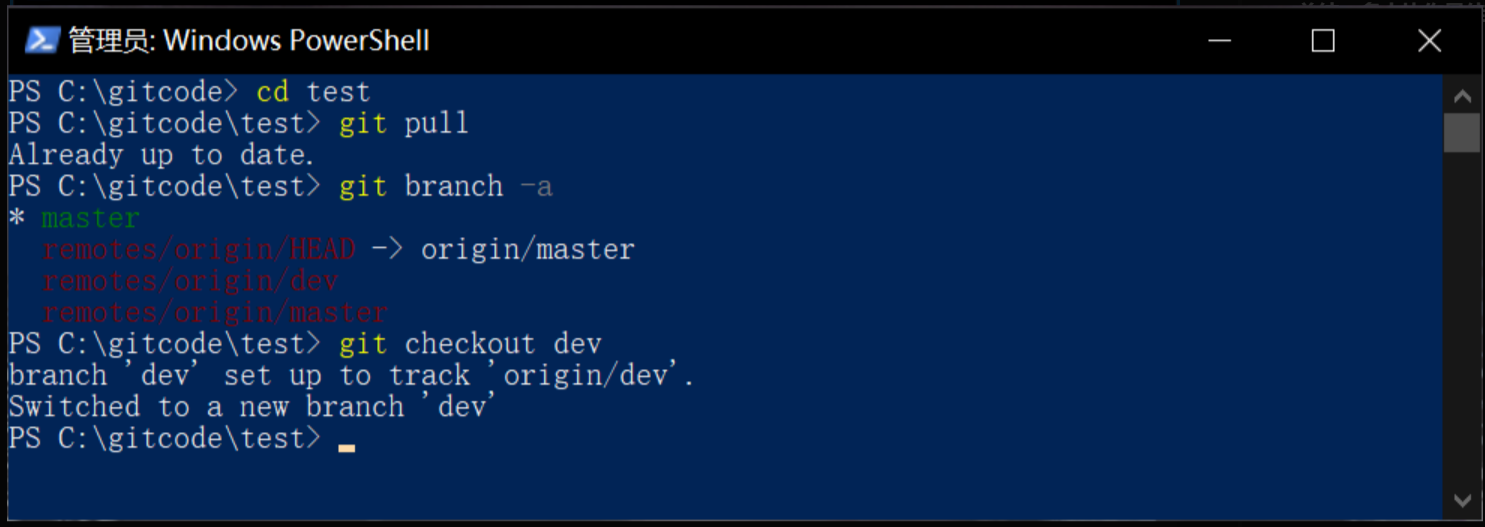 拉取后便可以看到远程的dev分支,接着切换到dev分支供我们进行本地开发。要说明的是,我们切换到的是本地的dev,根据示例中的操作,会将本地分支和远程分支进行关系链接