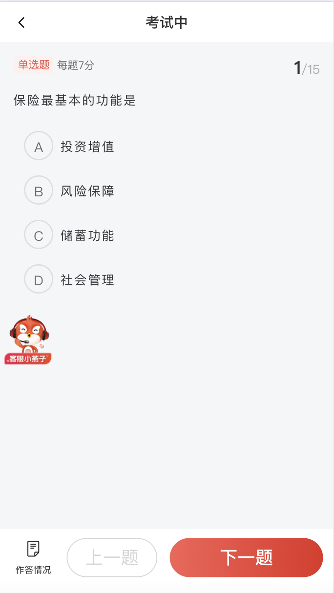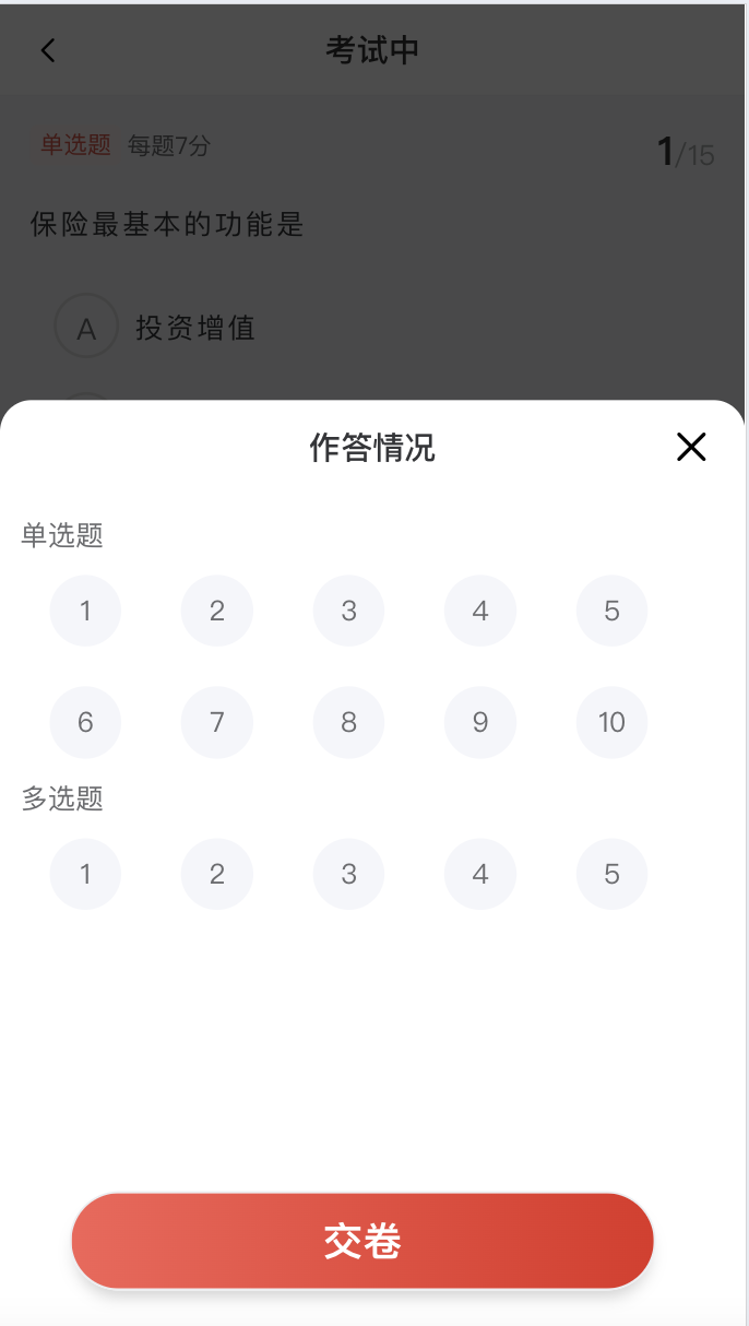 题目前会展示当前题目类型和题目分数以及当前题数,左下角可以查看当前答题情况。后端返回的数据是一个大数组,每一项包含题目、题目类型、所有答案选项(最多四个)、题目code、题目分值、正确答案。