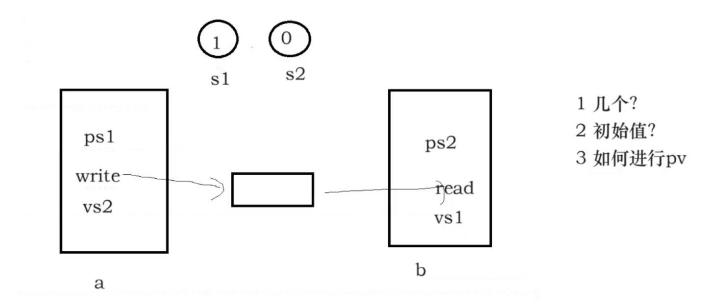 s1初始 1、s2初始 0;a:ps1→写→vs2;b:ps2→读→vs1,完成写一读交替同步。