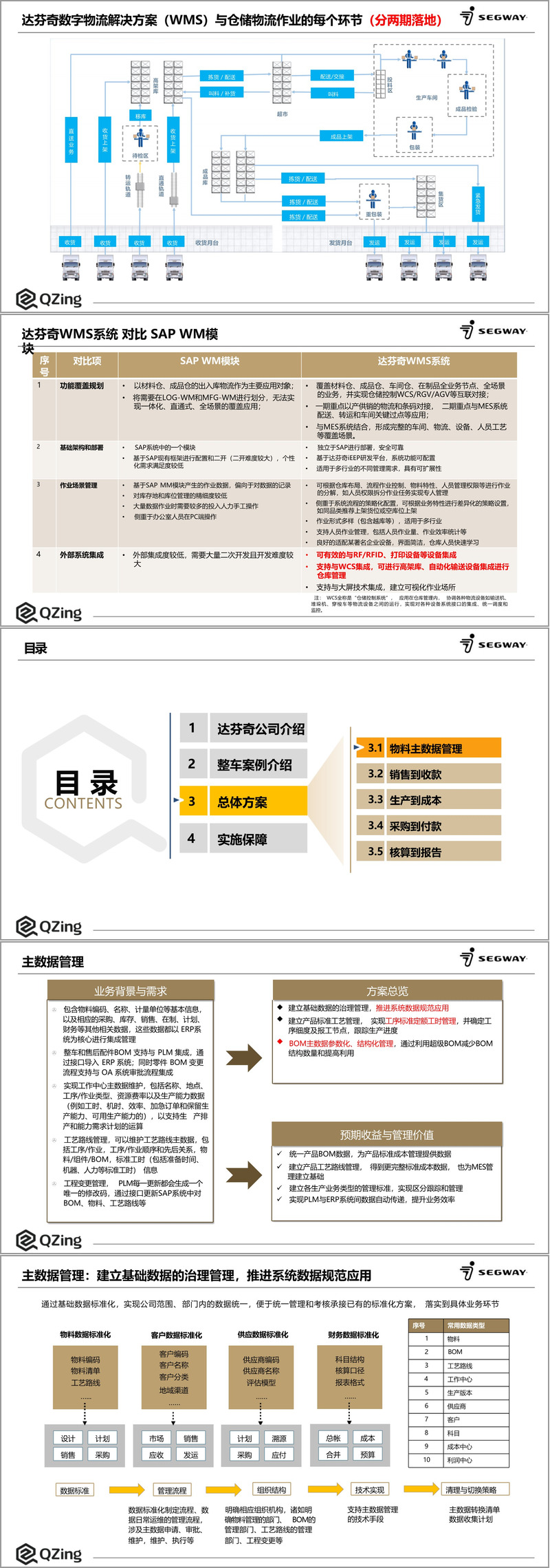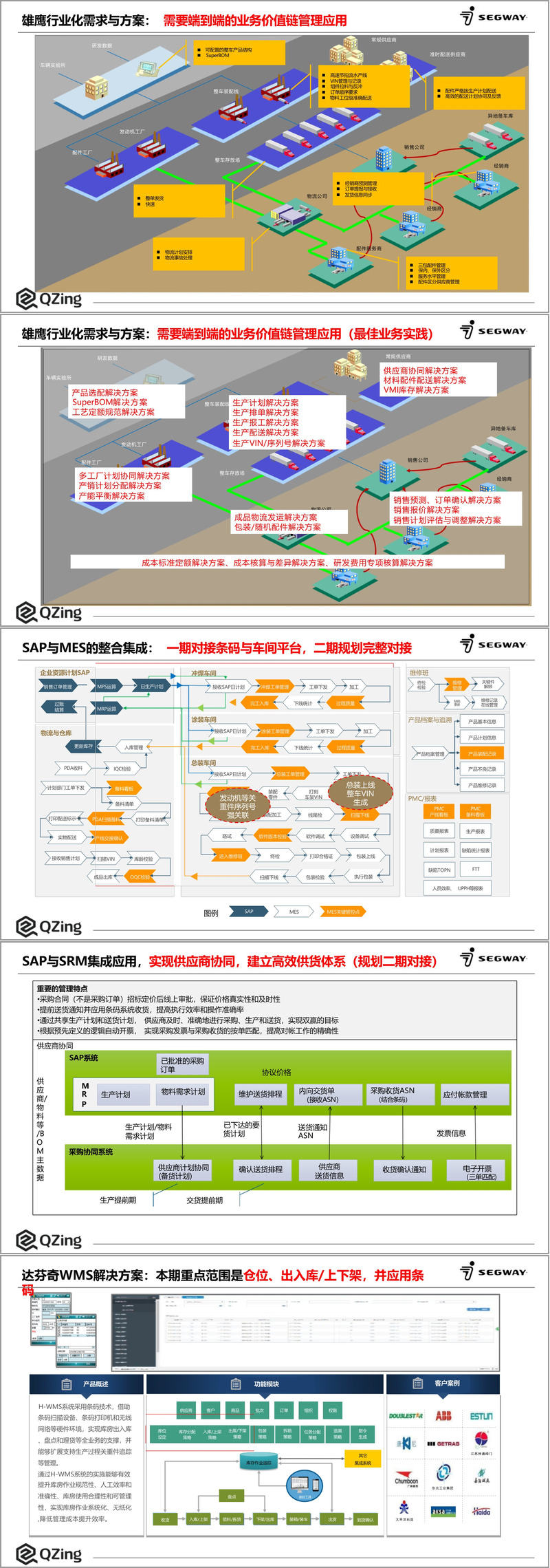 该方案以"达芬奇"公司为实施主体,围绕平衡车制造企业的核心业务场景,提出了以SAP ERP系统为核心,集成MES(制造执行系统)、SRM(供应商关系管理)、WMS(仓储管理系统)、CRM(客户关系管理)等系统的数字化平台架构。项目目标在于实现端到端的业务流程贯通,推动业务财务一体化,提升运营效率与管理精细化水平。