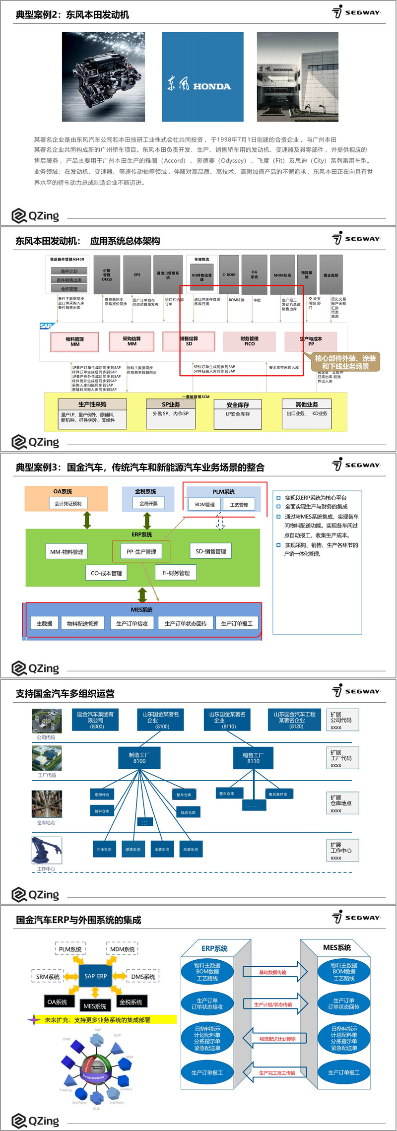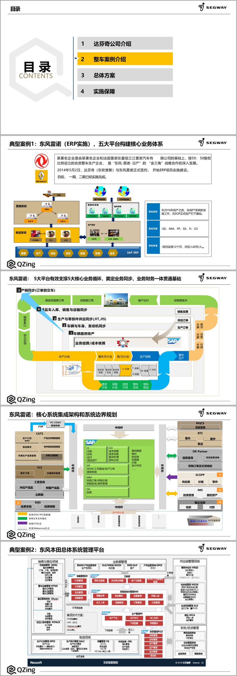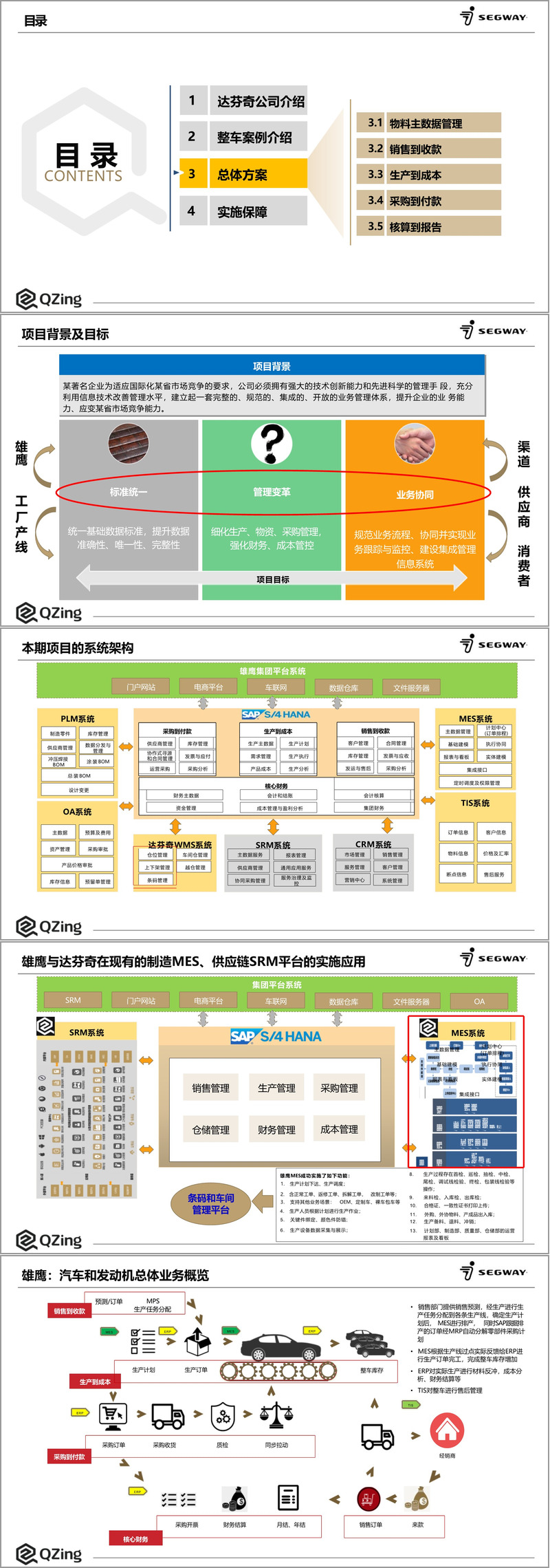 在总体方案部分,文件构建了"五大平台"支撑"五大核心业务循环"的框架。这五大循环包括销售到收款、采购到付款、生产到成本、物料主数据管理、核算到报告。通过典型案例------如东风雷诺、东风本田发动机、国金汽车------展示了该架构在汽车行业的成功实践,尤其强调跨系统集成、订单全程可追溯、产销协同与成本精准核算等关键能力。