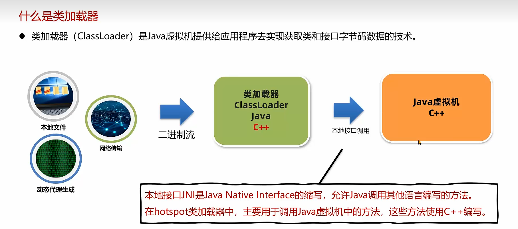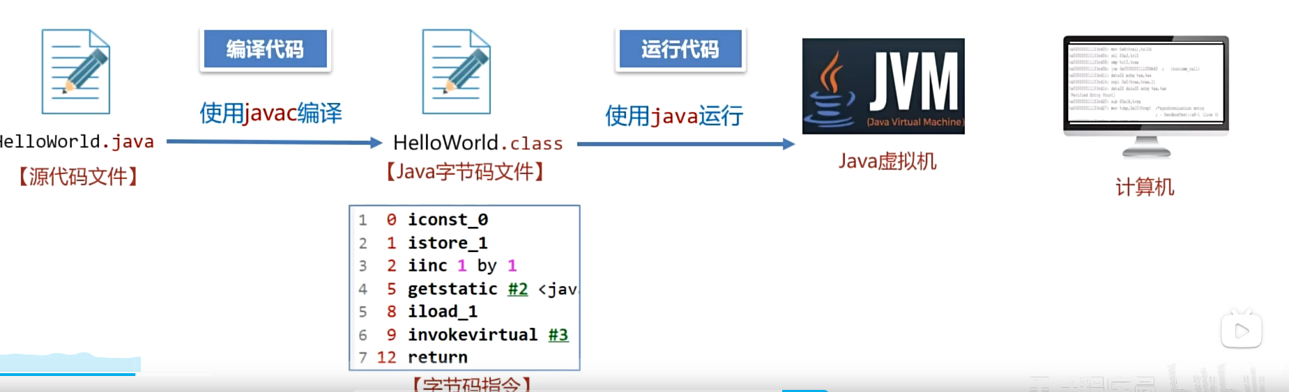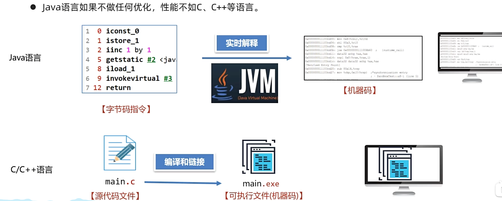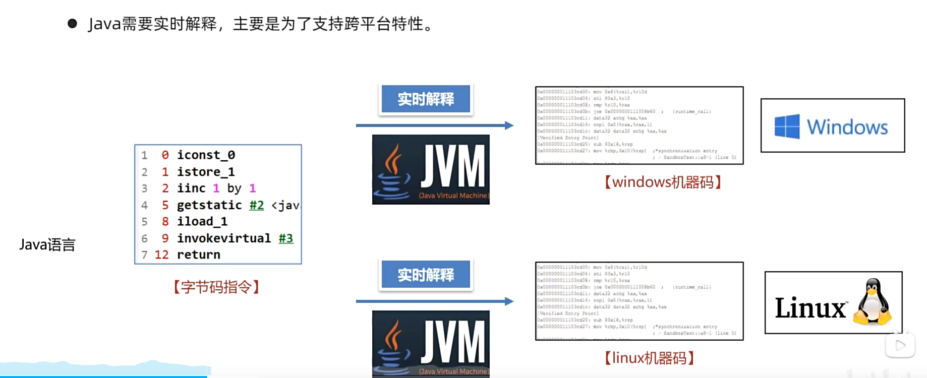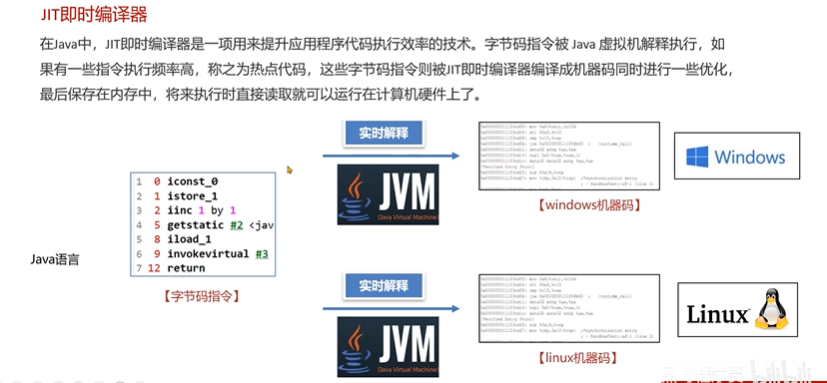 对字节码文件中的指令,实时的解释成机器码,让计算机执行