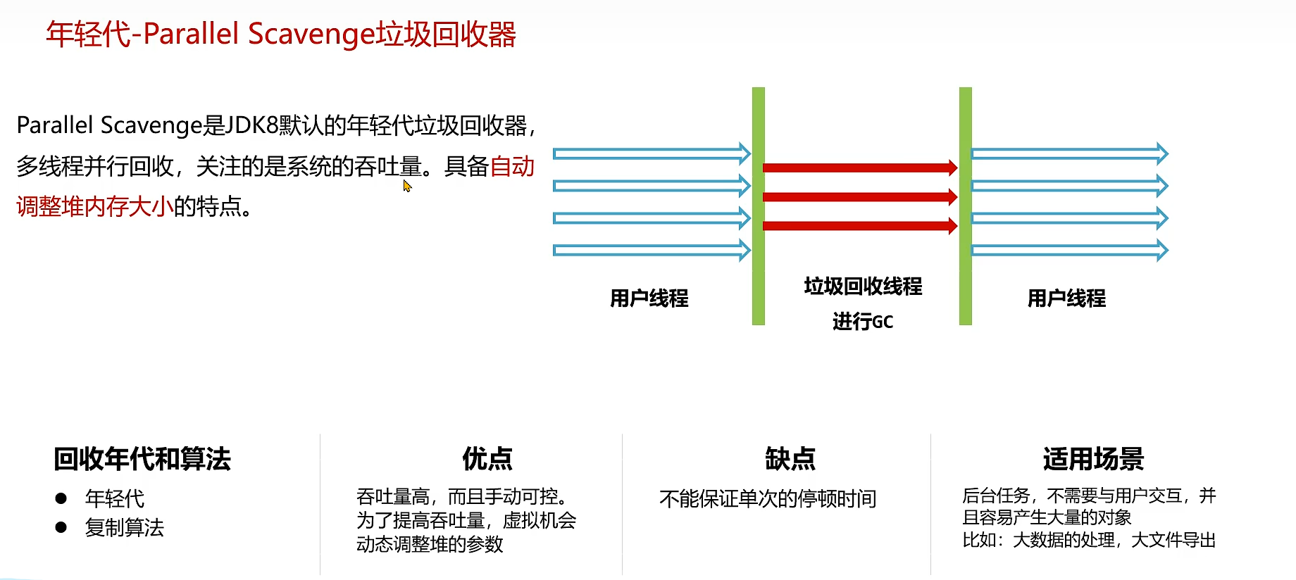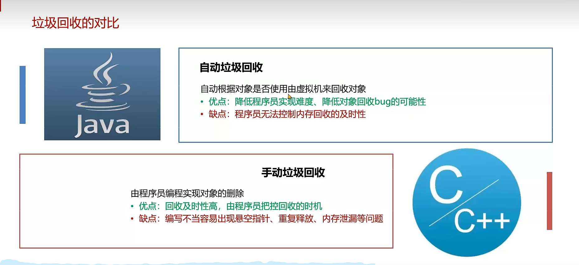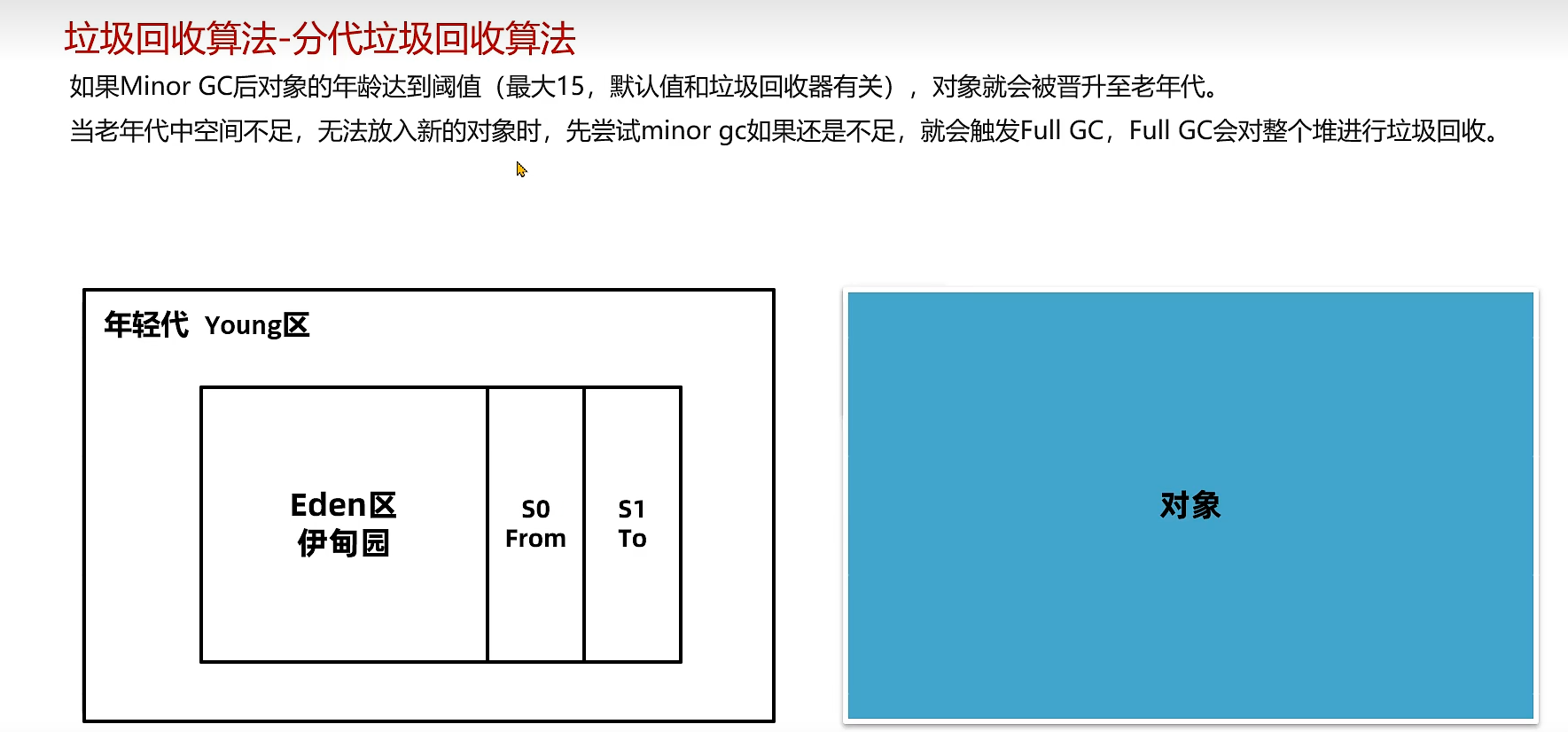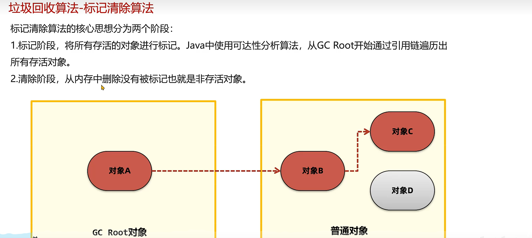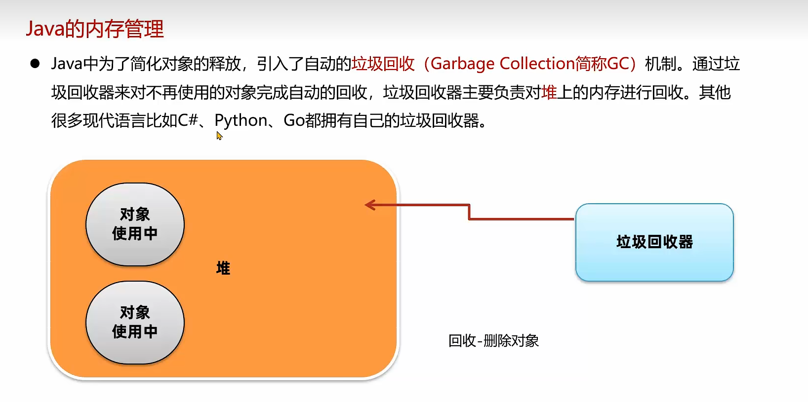 自动的垃圾回收机制,回收不再使用的对象