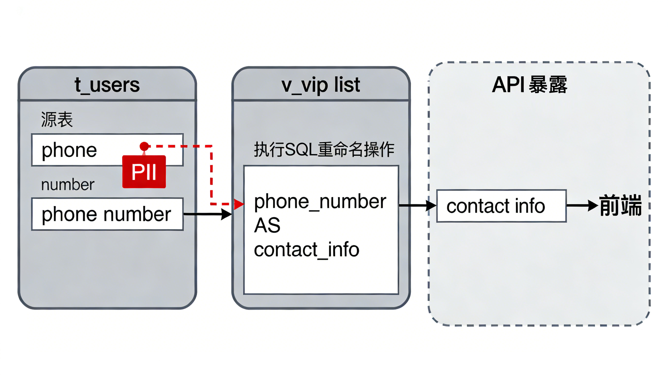phone_number,却不认识contact_info。结果,这个"穿了马甲"的敏感字段,就这样大摇大摆地绕过了脱敏规则,直接暴露在前端或 API 接口中。