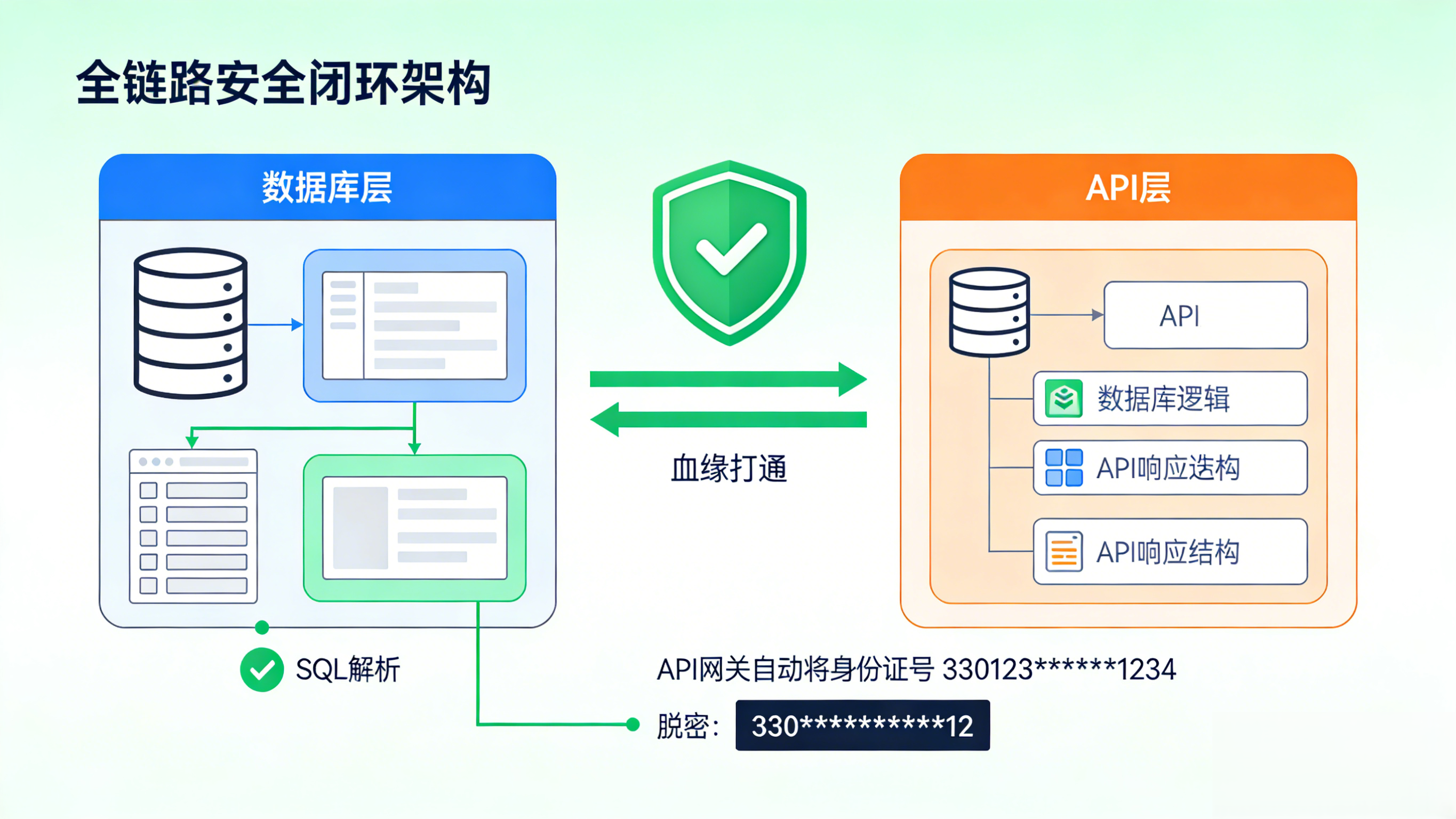 系统根据血缘关系,自动识别出某个 API 的返回值中包含源端的"身份证号",从而在 API 网关层自动触发动态脱敏策略(如变为 330***********12),而无需开发人员手动编写脱敏代码。