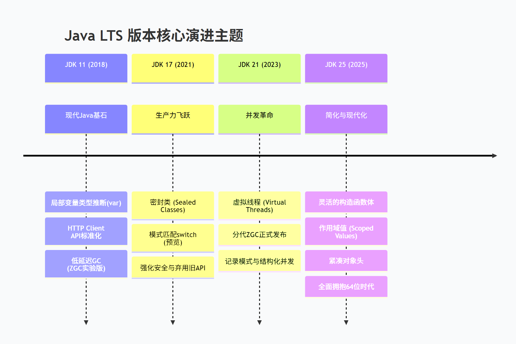 Java在JDK 8之后进入了快速迭代周期。本系列文章重点分析的长期支持(LTS)版本是生产环境部署的基石,每个LTS都代表了Java发展的一个重要里程碑。JDK 25作为最新的LTS,标志着Java在简化开发、提升性能和支持现代硬件方面进入了新阶段。