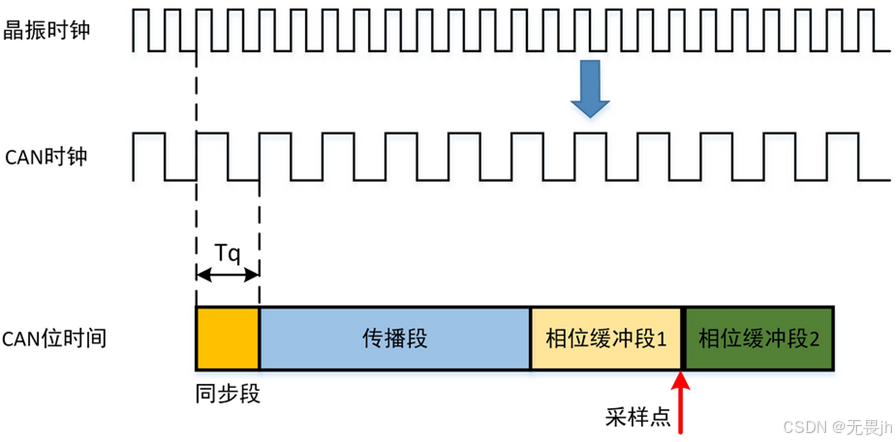 在一个位时间中按照Tq单位分为同步段、传播段、相位缓冲段1、相位缓冲段2。