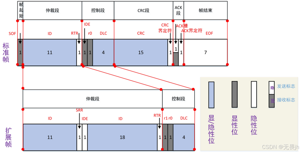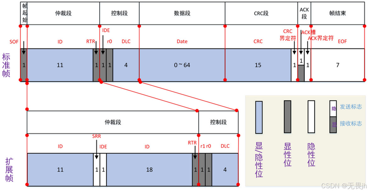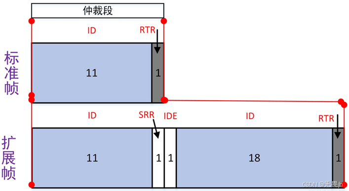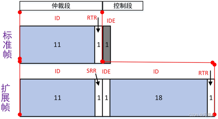 **IDE(Identifier Extension,标志位扩展):**用于区分标准格式(显性位0)和扩展格式(隐性位1),保证标准远程帧优先级高于扩展远程帧。