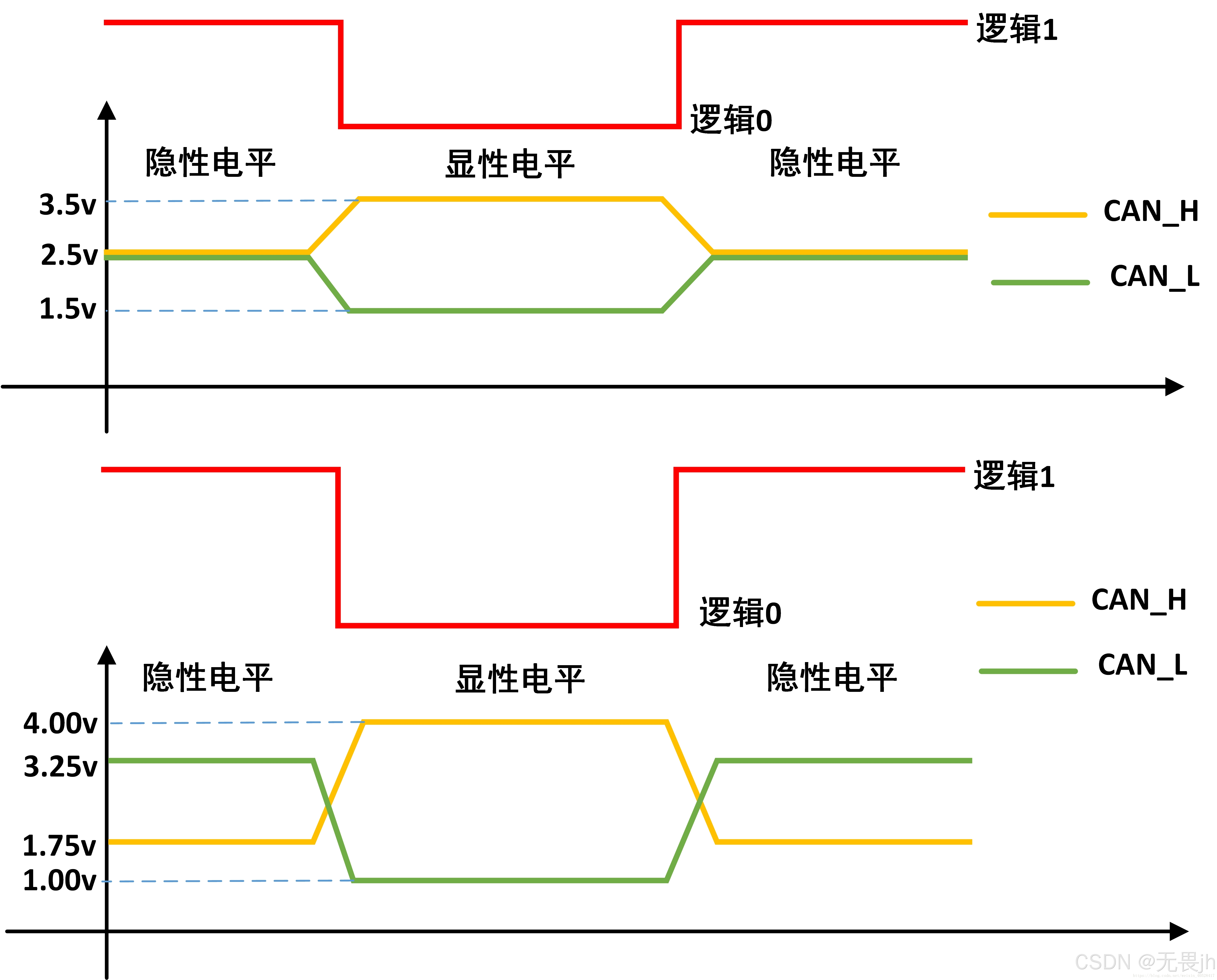 (2)隐形电平:CAN高和CAN低之间电压差典型值为-1.5V(CAN高为1.75V,CAN低为3.25V);