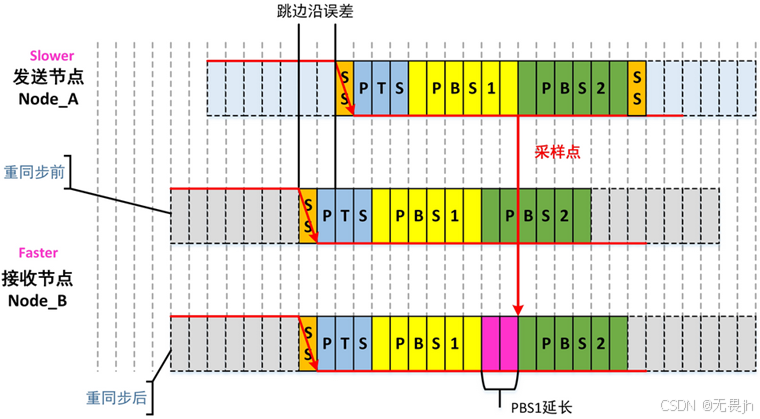 **相位缓冲段2(PBS2):**补偿时钟误差(通过重同步缩短)。