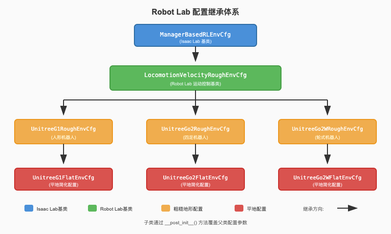 ManagerBasedRLEnvCfg基类到机器人特定配置的完整继承链,以及各层配置的职责划分。通过__post_init__方法实现参数的层层覆盖,既保证了代码复用,又提供了充分的定制灵活性。 -