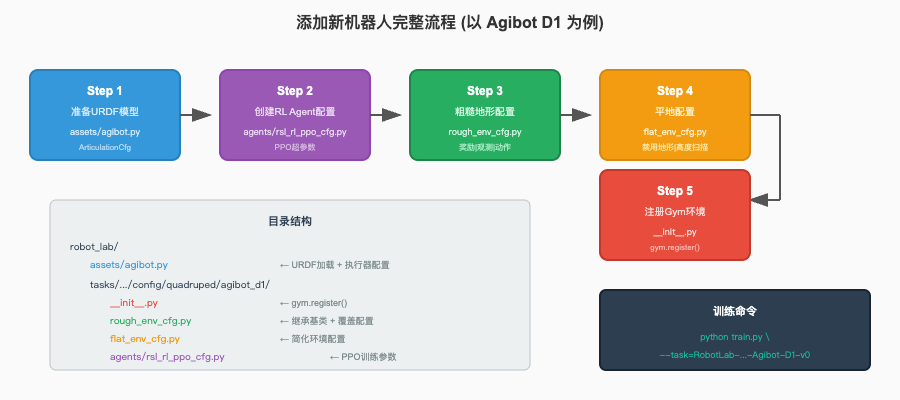 掌握新机器人添加流程:包括资产配置(URDF 加载、执行器参数)、环境配置(观测、动作、奖励)、Agent 配置(网络架构、PPO 参数)以及 Gym 环境注册的完整五步流程。