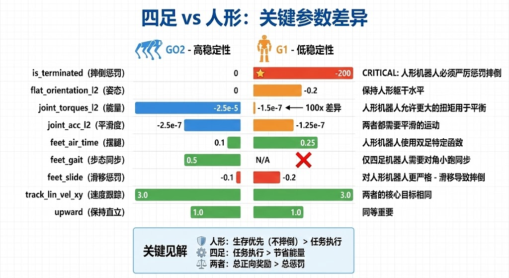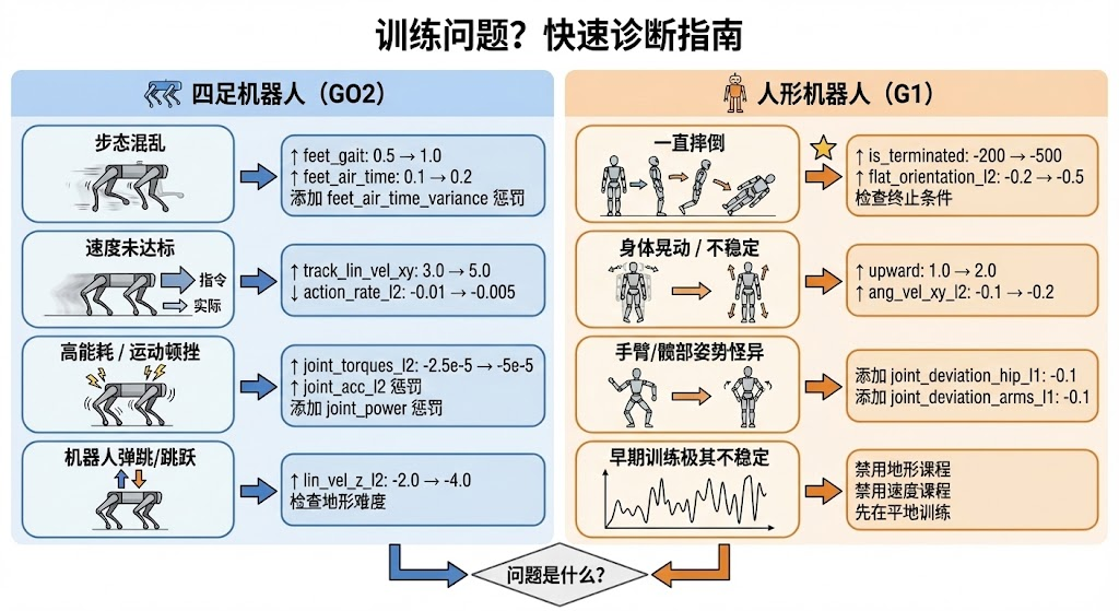 应用调参策略:针对四足、人形、轮式三种不同类型机器人的特点,给出了具体的奖励权重设置建议和常见问题的解决方案。