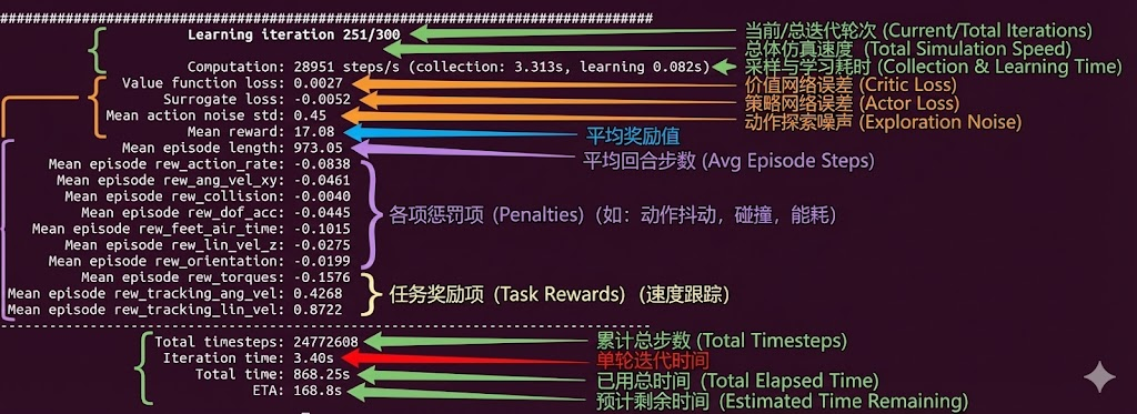 - Episode Length:每个 episode 的平均长度。如果机器人频繁摔倒,这个值会很低。