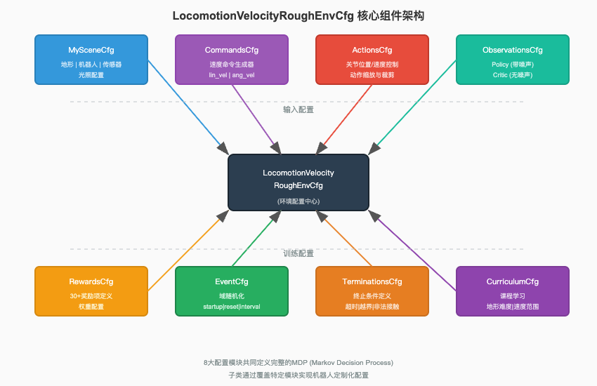 LocomotionVelocityRoughEnvCfg 是 Robot Lab 运动控制任务的核心基类,位于 velocity_env_cfg.py 文件中。该类定义了构成马尔可夫决策过程(MDP)的全部要素,包括状态空间、动作空间、奖励函数、状态转移规则等。理解这个基类的设计,是掌握整个 Robot Lab 配置体系的关键。
