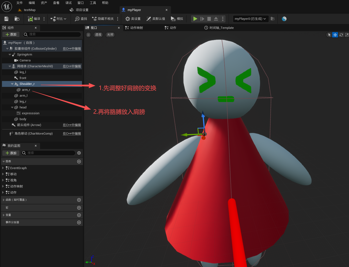 3.添加肩膀:创建模型时,要先创建上级的变换,再创建下级的变换