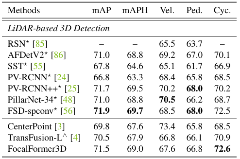 表3. Waymo验证集上的性能比较。所有模型均输入单帧点云。带∗标记的方法表示在VoxelNet中使用了不同的点云主干。带∧标记的方法表示我们的复现。采用的评估指标为LEVEL2难度,并在完整的Waymo验证集上报告结果。