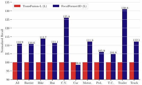 按类别的召回率比较。我们在类别层面对图6中的目标候选进行类别召回率分析比较。结果突出了 FocalFormer3D 在提高初始 BEV 查询的相对召回率方面的有效性,相对于 TransFusion-L 提升了 10.9%。大型物体如工程车辆和挂车获得的改进最多,因为它们的初始中心预测较具挑战性。