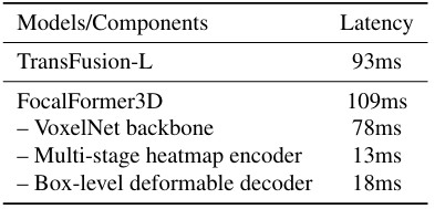 模型组件的延迟分析。我们对FocalFormer3D在nuScenes数据集上进行了延迟分析。运行时间是在相同的V100 GPU机器上测量的以便进行比较。为了确保与CenterPoint[3]的速度比较公平,动态图体素化[87]被用于TransFusion-L和FocalFormer3D的速度测试。计算时间大部分消耗在基于稀疏卷积的骨干网络(VoxelNet [1, 22]),耗时78毫秒。我们的多阶段热图编码器收集各阶段热图中的查询耗时13毫秒,而框级可变形解码器头耗时18毫秒。需要注意的是,多阶段热图的生成仅耗时5毫秒,额外操作如Top-K选择耗时7毫秒,这表明未来的工作存在潜在的优化空间。