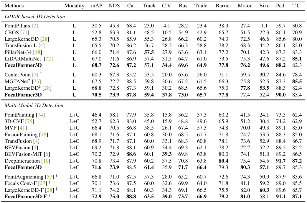 表1. nuScenes 3D 检测测试集上的性能比较。†表示使用翻转测试时的增强。‡表示同时使用翻转和旋转测试时的增强。C.V、Motor.、Ped. 和 T.C. 分别是施工车辆、摩托车、行人和交通锥的缩写。