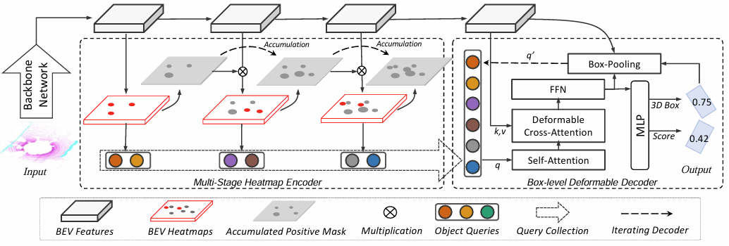 图2. FocalFormer3D的整体架构。整体框架包含两个新颖组件:一个多阶段热图编码网络,它使用Hard Instance Probing(HIP)策略生成高召回率的目标查询(候选),以及一个带重新评分机制的可变形Transformer解码网络,负责从大量候选中消除误报。 (a) 在从各模态提取特征后,地图视图特征生成一组多阶段BEV(鸟瞰视图)特征,然后生成BEV热图。正样本掩码用于累积排除前阶段容易的正样本候选。剩余的目标候选根据BEV热图的响应在多阶段过程中被选取和收集。 (b) 一个可变形Transformer解码器被调整以有效处理多样化的目标查询。查询嵌入通过一个框池化模块得到增强,该模块利用中间目标监督来识别局部区域。它以局部范围的方式优化目标查询,而不是点级别。为清晰起见,图中未显示残差连接和归一化层。