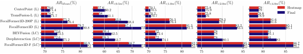 回顾最终目标预测的召回对比。关于3D检测器的最终预测,如图5所示,大多数LiDAR和融合方法在距离阈值增加时性能提升有限。这可以解释为较高的距离阈值对应于漏检的极端情况的性能。引入相机特征有助于模型在透视视角下理解上下文,从而带来更好的性能,如DeepInteraction。然而,它们的最终预测召回率仍远落后于FocalFormer-F,差距高达6.8个百分点。