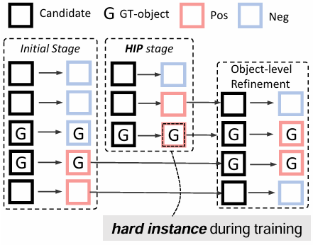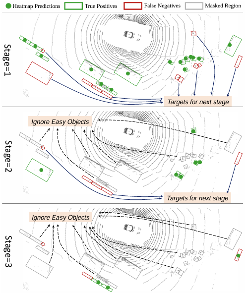 为了解决3D检测中的假阴性问题,我们提出并构建了一个名为困难实例探测(HIP)的流程。受级联式解码器头在目标检测中的启发[16--18],我们提出了一个逐步探测假阴性样本的流程,这显著提高了召回率。图1以级联的方式展示了该流程。在每个阶段,HIP会抑制真正的正样本候选,并专注于前一阶段的假阴性候选。通过迭代HIP阶段,我们的方法能够挽回那些难以检测的假阴性样本。