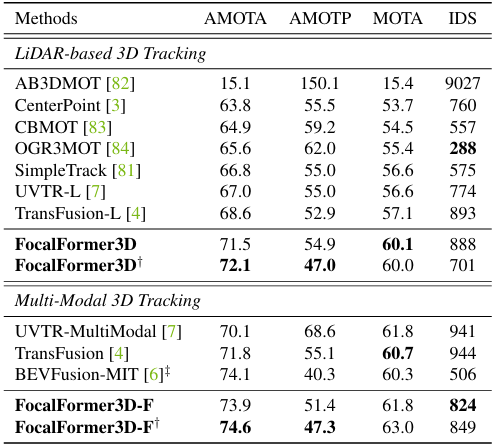 表2. nuScenes 3D 跟踪测试集上的性能比较。† 基于表1中的双翻转测试结果。‡ 基于模型集成。