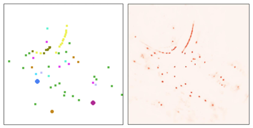 图4. 正样本掩码的示例可视化。(左) 和预测的BEV热图 (右)。正样本掩码具有类别感知性,我们使用不同颜色展示不同类别以进行可视化。在基于池化的掩码方法中,不同类别物体的掩码区域可能会有所不同。