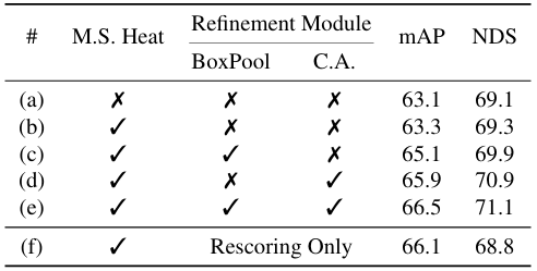 表6. 模块逐步改进。"M.S. Heat"表示将多阶段热图编码器应用于难例探测。"C.A."表示在第二阶段精化中使用可变形交叉注意力。"BoxPool"表示Box池化模块。术语"仅重评分(RescoringOnly)"指的是直接从BEV特征生成框预测并使用其解码器头对来自热图的候选预测进行重评分,而不执行额外的边界框精化的模型。