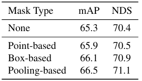 然而,点掩码策略效率较低,因为与使用真实框指导的理想掩码相比,每个正预测仅排除了一个 BEV 对象候选。因此,掩码区域与排除操作的有效性之间存在权衡。我们在表 5 中比较了三种策略,基于池化的掩码表现优于其他方法。