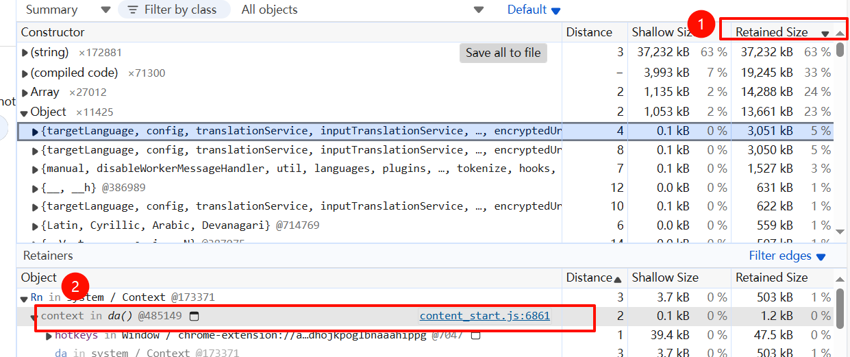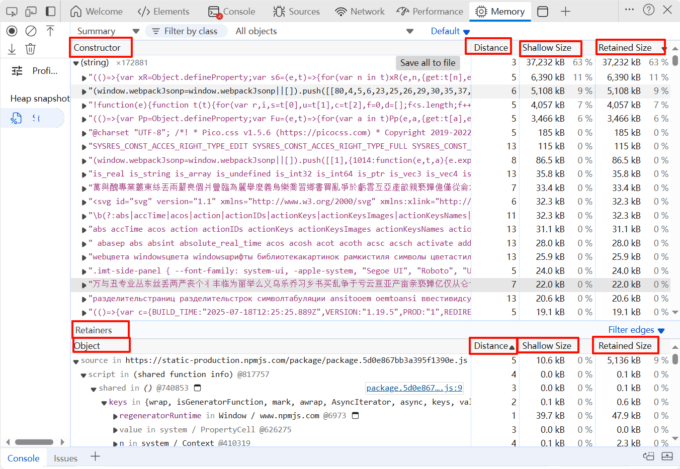 - 找到 Retained Size 中的最大实例:在内存堆快照中,找到 Retained Size 最大的对象实例。