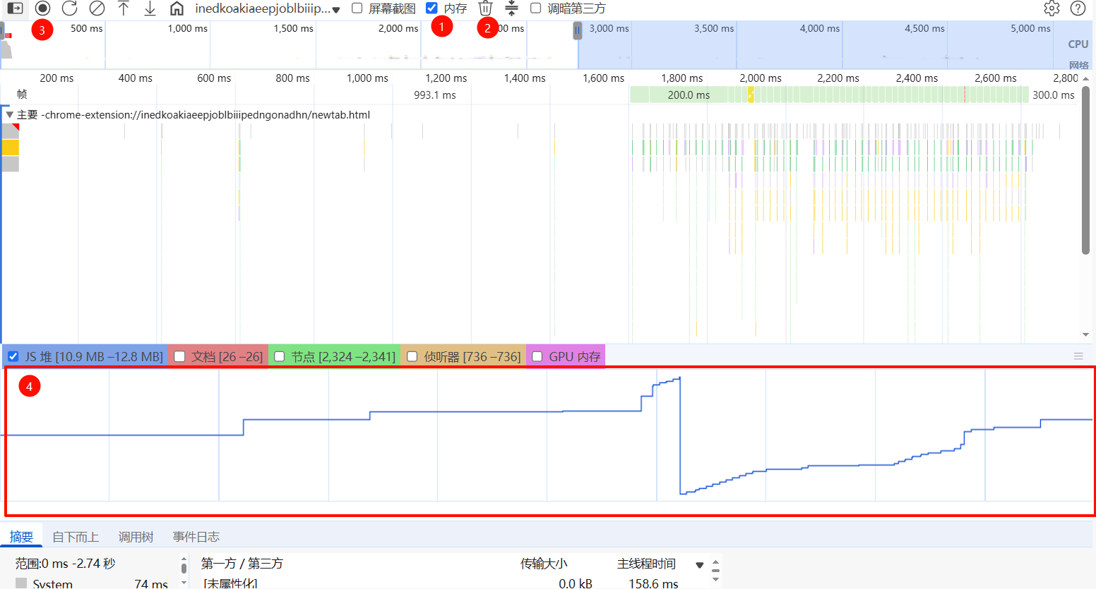 - 运行性能检测(图中 3),执行可能存在的内存泄漏的操作(页面切换、组件挂载、弹窗、事件等)。