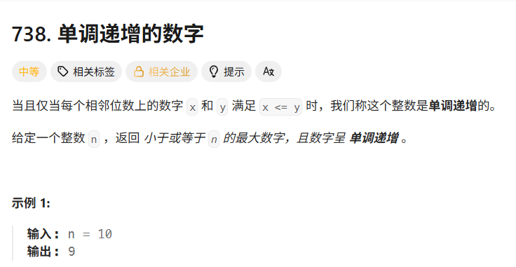 欢迎来到贪心算法专题第十五篇! 这道题非常有意思,有点像小学数学里的"借位减法"。 题目要求:给定一个非负整数 N,找出小于或等于 N 的最大整数,且该整数的每一位数字必须是单调递增 的(即 1234 可以,132 不行)。
