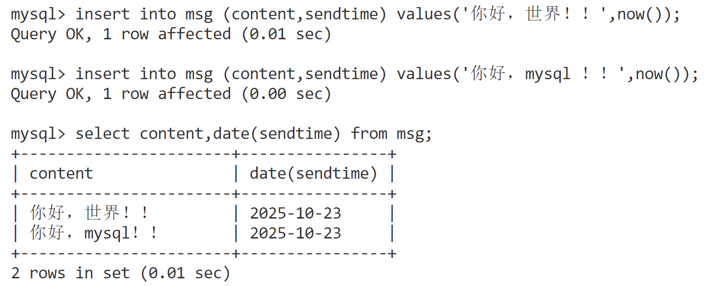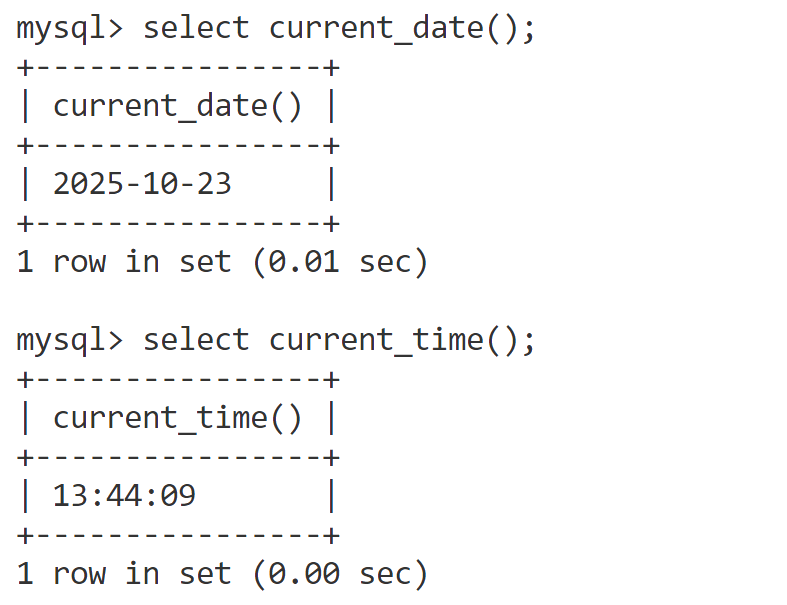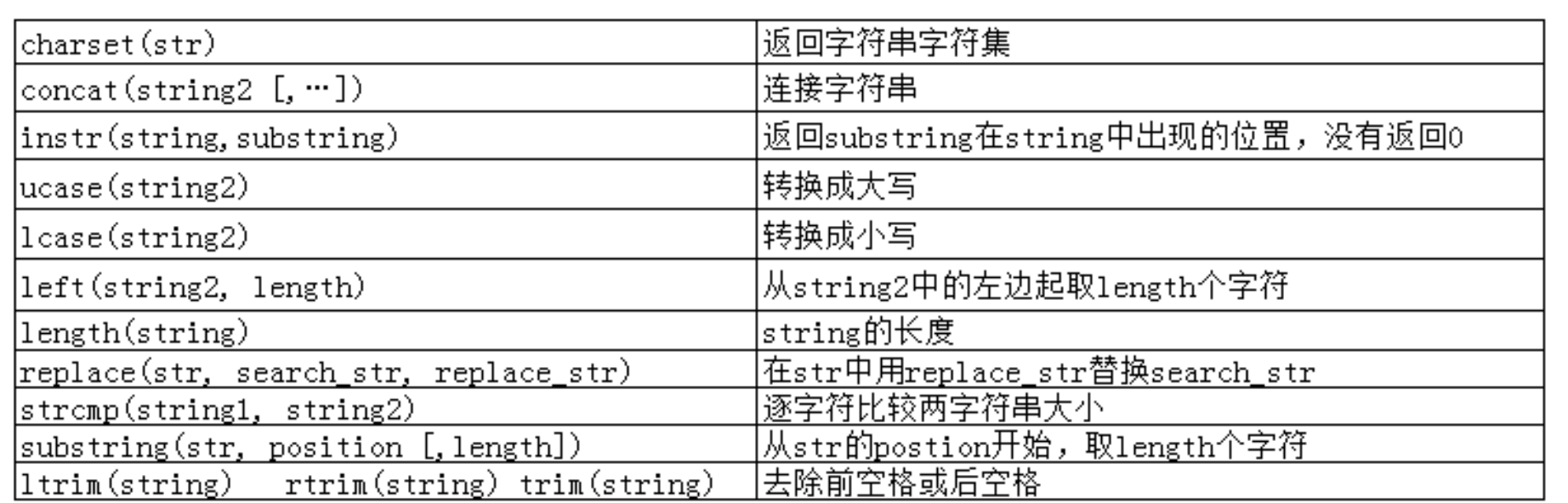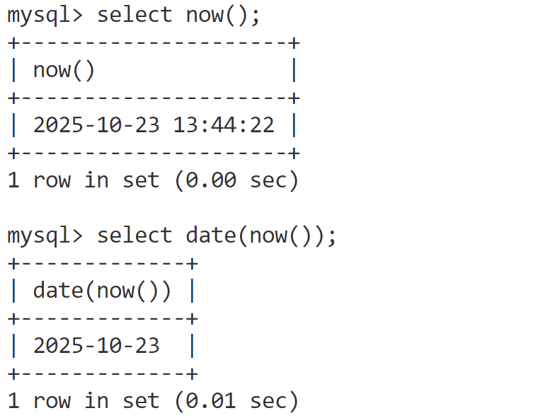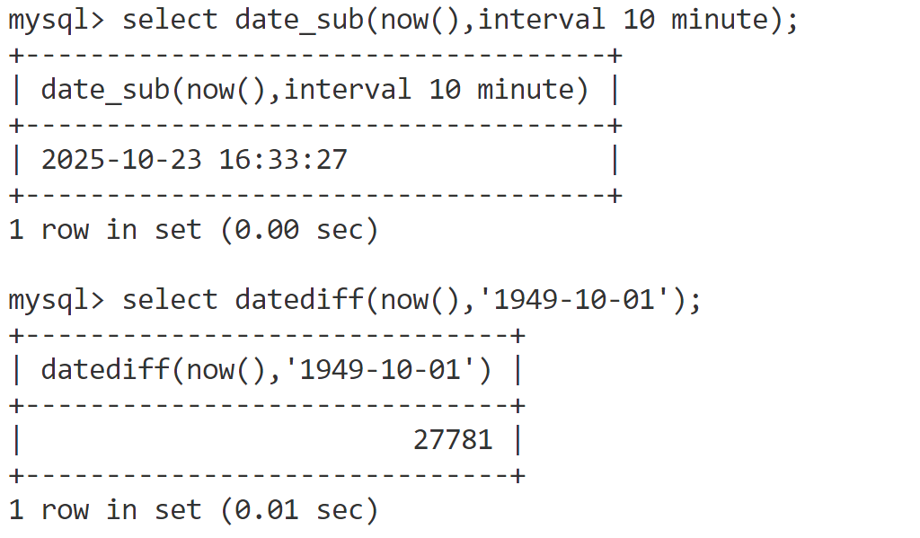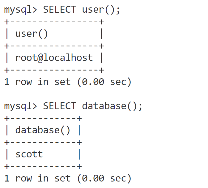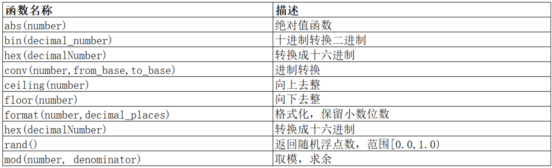 \^\] 从name的第一个位置开始截取两个字符  * 以首字母小写的方式显示emp标准所有员工的姓名 ```sql SELECT ename, concat(lcase(substring(ename, 1, 1)), substring(ename, 2)) FROM emp; ``` \[\^\]: 表示使用concat连接使用lcase来将substring截取的ename中的第一个字符变成小写和substring截取的ename第一个字符之后的字符串;**substring(ename, 1, 1) 从第一个位置开始,截一个字符**  ## 三、数学函数  * ceiling(number) 向上去整 * floor(number) 向下去整 一般取整的时候是进行 **四舍五入** 取整,但是除了四舍五入还有其他的取整方式。我们把丢弃小数部分的取整方式称为**向0取整**,以前我们在 C 学的 9 / 2 = 4 就是向0取整,还有向大的方向取的向上取整、向小的方向取的向下取整  案例: * 绝对值 ```sql select abs(-100.2); ```  * 向上取整 ```sql select ceiling(23.04); ``` * 向下取整 ```sql select floor(23.7); ```  * 保留 2 位小数位数(小数四舍五入) ```sql select format(12.3456, 2); ``` * 产生随机数 ```sql select rand(); ```   ## 四、其它函数 * 查询当前用户 ```sql SELECT user(); ``` * 显示当前正在使用的数据库 ```sql SELECT database(); ```  * 一个字符串进行md5摘要,摘要后得到一个32位字符串 ```sql select md5(string); ``` > MD5 摘要是一种密码散列函数(Hash 函数),用于将任意长度的输入数据(如文本、文件等)转换为一个固定长度(128 位,通常表示为 32 个十六进制字符)的哈希值(摘要)。 > > 其核心特点包括: > > 1. **固定长度输出** :无论输入数据长度如何,输出的 MD5 摘要始终是 32 个十六进制字符(例如:`d41d8cd98f00b204e9800998ecf8427e` 是空字符串的 MD5 值)。 > > 2. **不可逆性**:从理论上讲,无法通过 MD5 摘要反推出原始输入数据(虽然存在碰撞攻击,但不影响不可逆性的本质)。 > > 3. **敏感性**:原始数据的微小变化(如一个字符的修改)会导致 MD5 摘要发生显著变化。 > > MD5 曾广泛用于数据完整性校验(如文件校验)、密码存储(将密码加密为 MD5 后存储,而非明文)等场景。但由于其存在碰撞漏洞(不同输入可能产生相同 MD5 值),目前已逐渐被更安全的 SHA-256 等算法替代,不再推荐用于安全性要求高的场景。 > > 例如,字符串 `hello world` 的 MD5 摘要是:`5eb63bbbe01eeed093cb22bb8f5acdc3`。   * 如果 val1 为null,返回 val2 ,否则返回 val1 的值(和三目运算符比较像) ```sql SELECT IFNULL(val1, val2); -- 如果 `val1` 为 `NULL`,返回 `val2`,否则返回 `val1` 的值 ```
