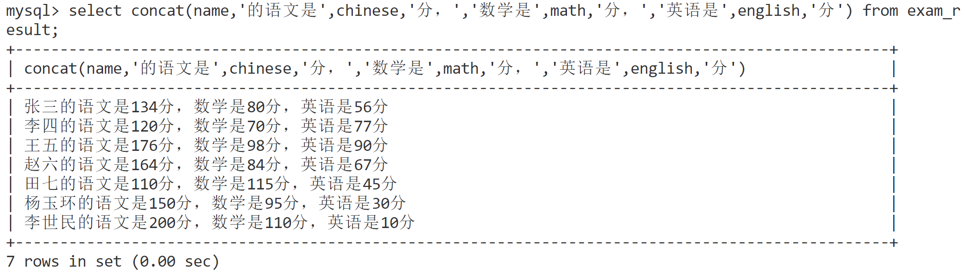 SELECT concat(name, '的语文是', chinese, '分,', '数学', math, '分,', '英语', english, '分') FROM exam_result;