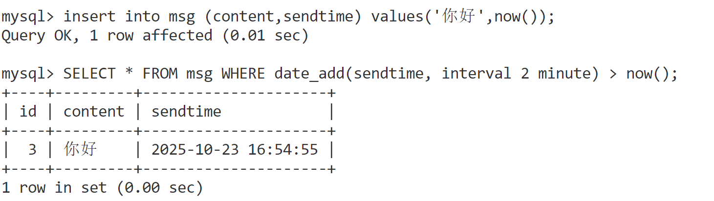 SELECT * FROM msg WHERE date_add(sendtime, interval 2 minute) > now();