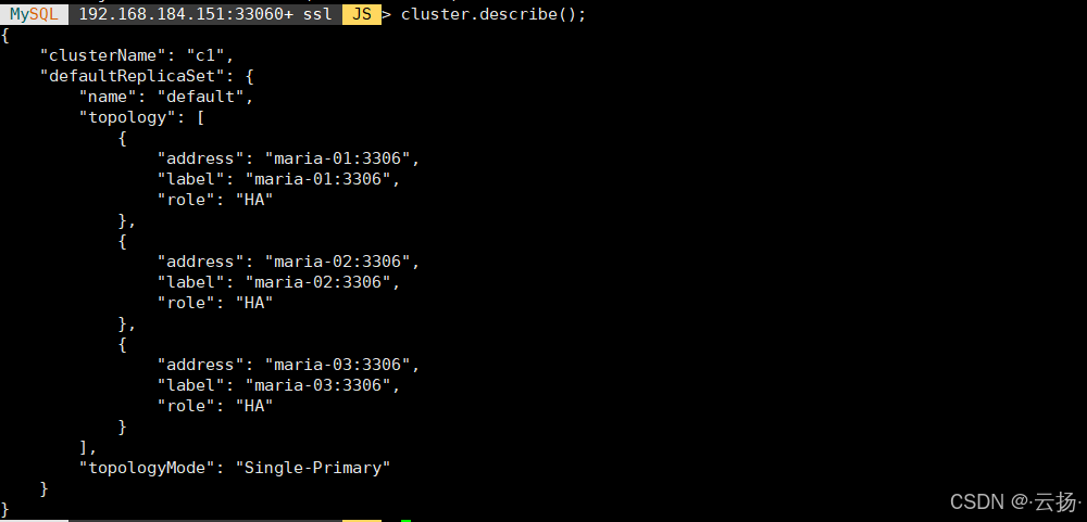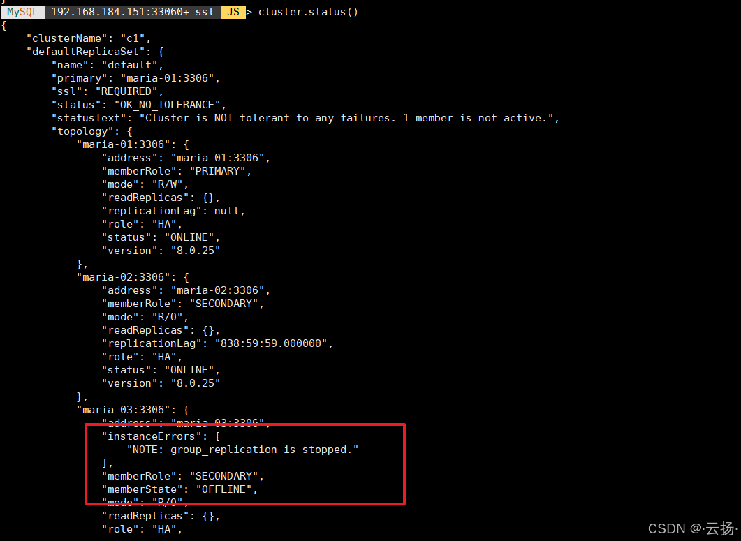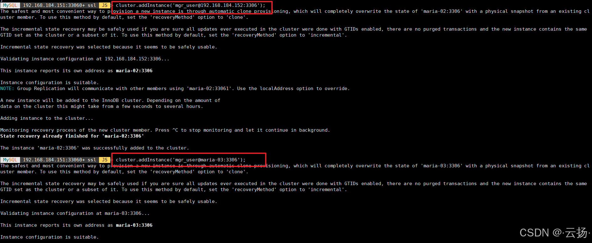 cluster.addInstance('mgr_user@maria-03:3306');