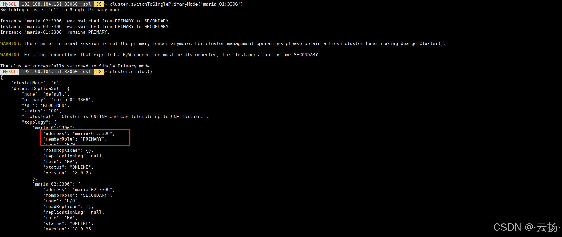 cluster.switchToSinglePrimaryMode('maria-01:3306');
