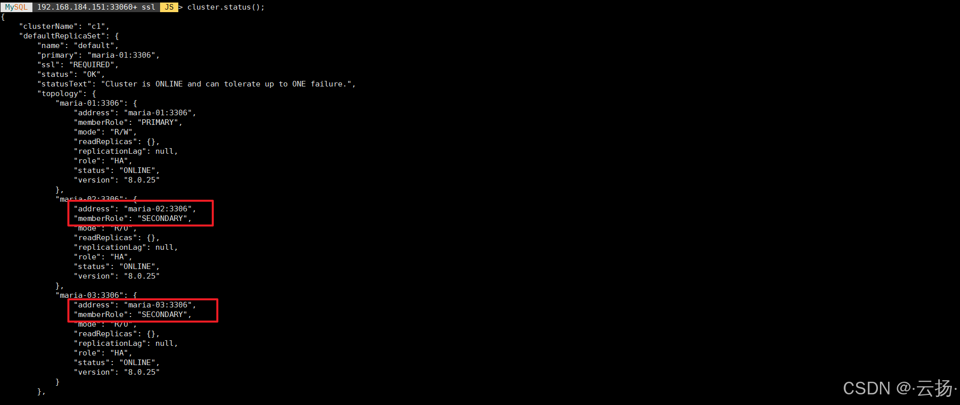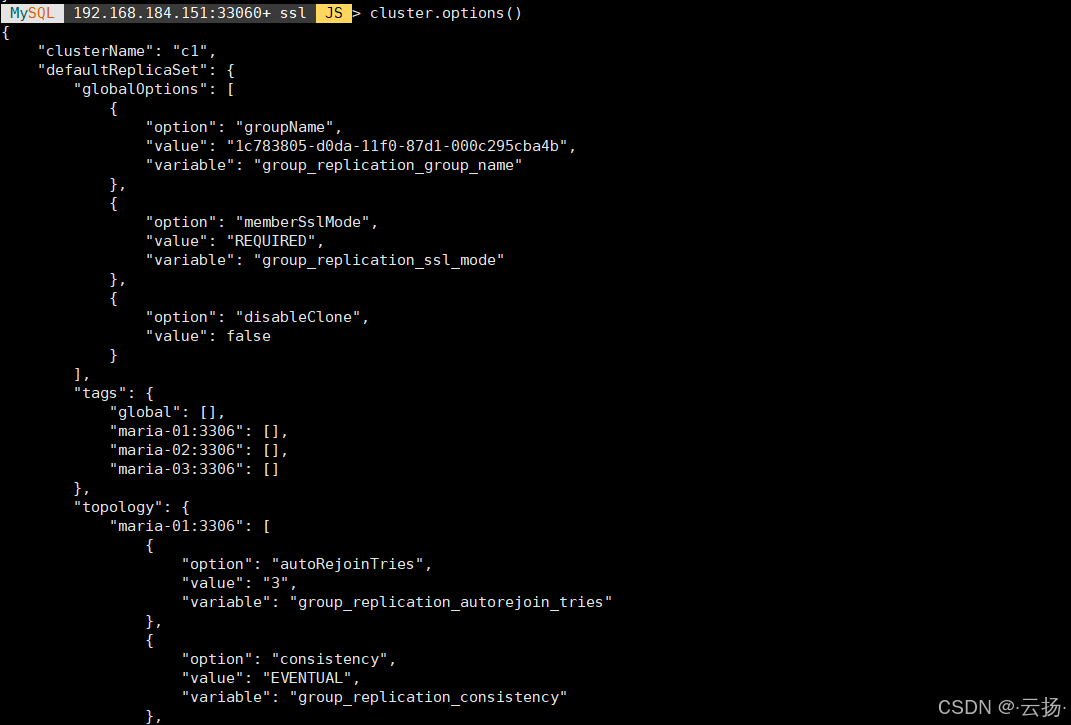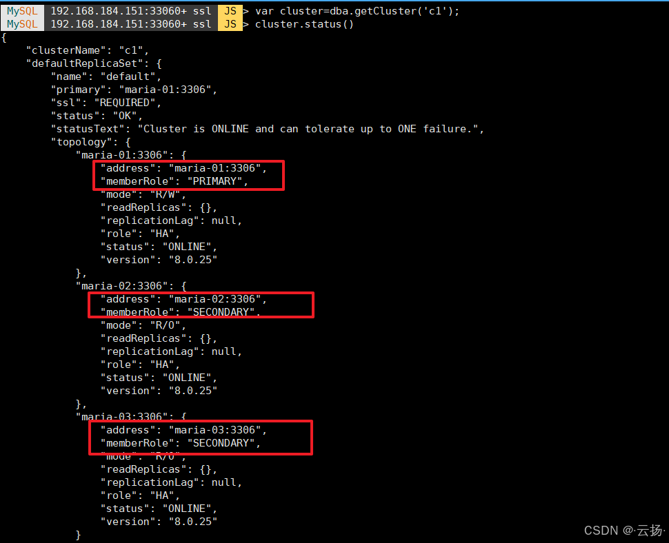 查看集群成员的具体配置(如实例地址、权重、故障转移优先级等),便于确认成员属性:
