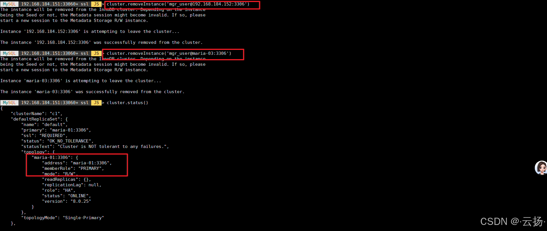 cluster.removeInstance('mgr_user@maria-03:3306');