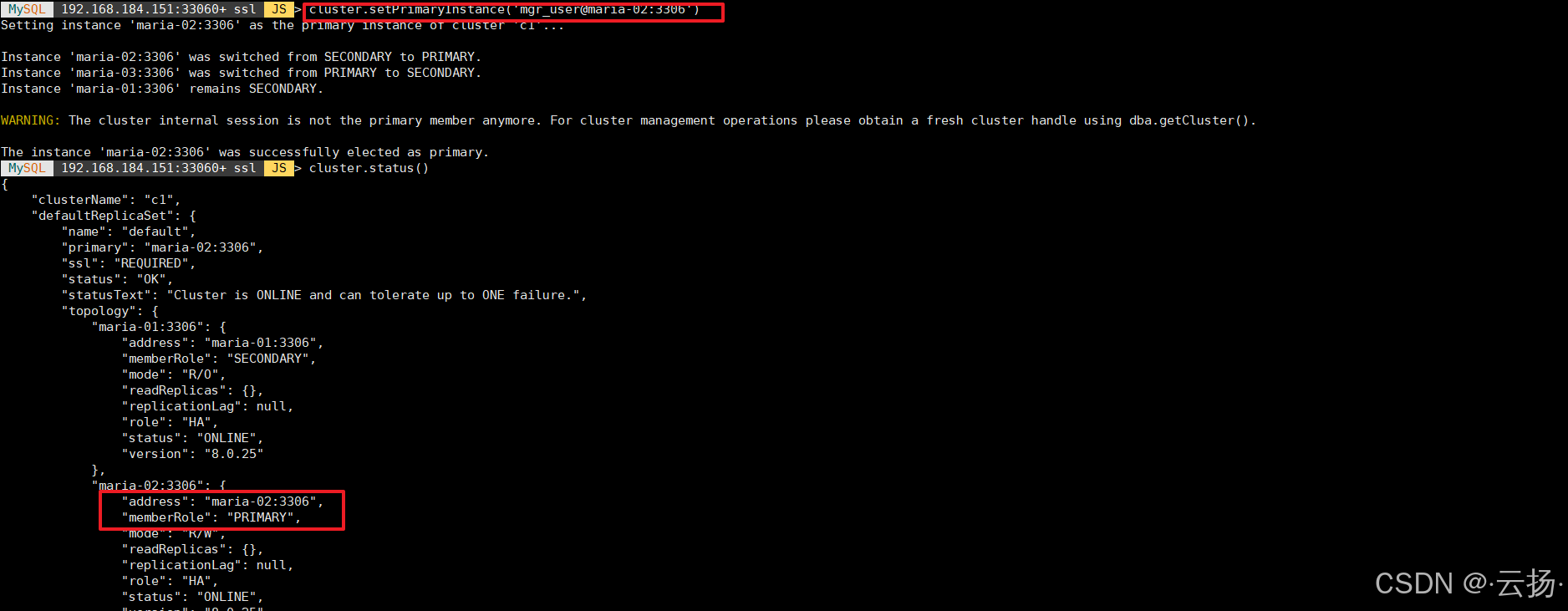 cluster.setPrimaryInstance('mgr_user@maria-03:3306');