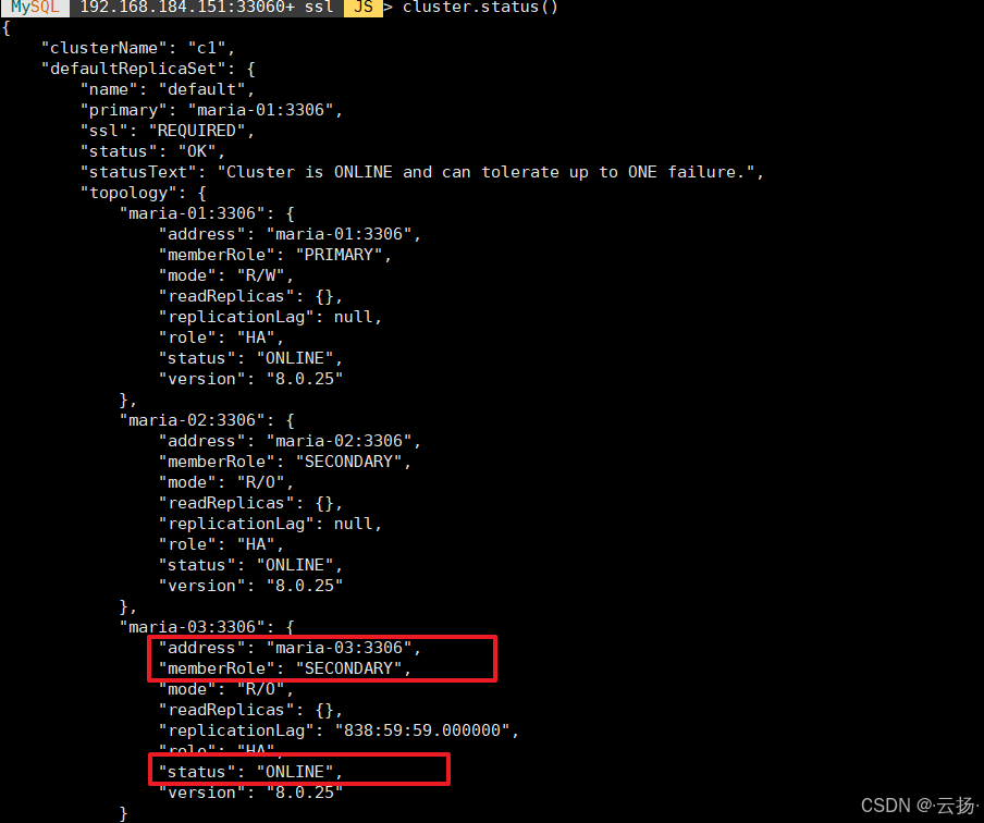 maria-03),需配置节点间的主机名解析(如/etc/hosts)。 - 状态校验 :所有操作前后均建议执行