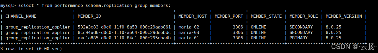 MEMBER_HOST:成员IP/主机名MEMBER_PORT:端口MEMBER_ROLE:角色(PRIMARY/SECONDARY)MEMBER_STATE:状态(ONLINE/OFFLINE/RECOVERING)