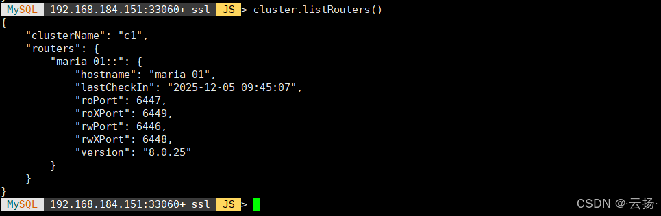 MySQL Router 是集群的入口,负责流量分发,通过以下命令可查看当前与集群关联的 Router 实例信息(如 Router 名称、地址、版本):