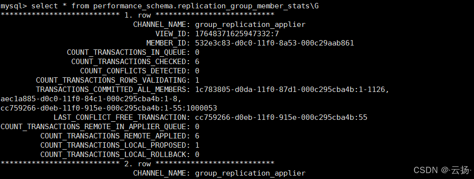 | COUNT_TRANSACTIONS_REMOTE_APPLIED | 从其他成员同步过来 并已成功应用的事务总数。 | 示例值 6 表示当前节点累计应用了6个来自其他节点的事务(与 COUNT_TRANSACTIONS_CHECKED=6 一致,说明所有校验通过的事务均为远程事务)。 |