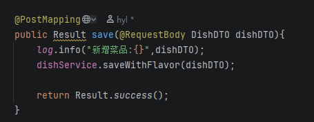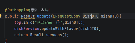 前端通过json传递参数,参数可以用DishDTO接收~这里没有什么需要返回给前端的所以代码如下: