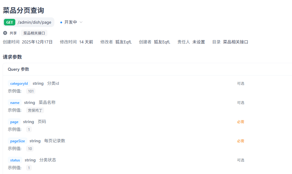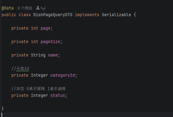 前端通过Query传递参数,也就是通过在url的问号后面以键值对的形式传参,page和pagesize是必须的,这玩意参数不定,所以还是要用一个对象来接收DishPageQueryDTO如下图所示: