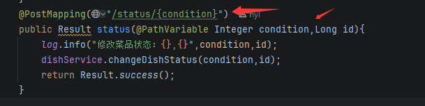 这个其实本质上也是菜品信息的修改一种,我们把status封装一个Dish对象里面传给DishMapper的update就好了