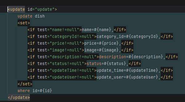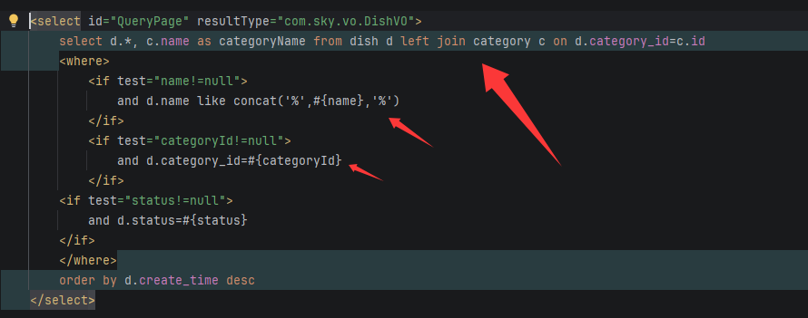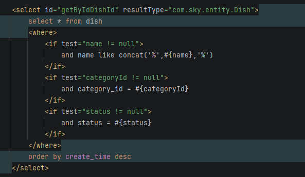 在Mapper层由于前端可能还会送过来name和categoryID进行模糊查询所以采用动态SQL,XML里代码如下: